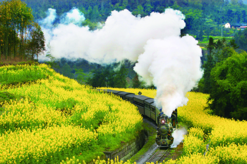 嘉阳小火车坐上开往春天的时光列车,每年阳春二三月,嘉阳火车的油菜花都会惊艳全国,丘陵之间连绵起伏、金灿灿的油菜花海。