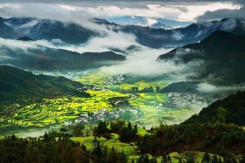 一园春色:婺源江岭,那里漫山遍野的油菜花呈梯田状,从山顶铺散到黑瓦白墙的徽派民居里,一直到山谷的最远端。