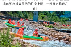 抵达嵩山漂流上站游客中心:位于石河上游的南蒋村,内设管理中心、游船码头、温室大棚等配套基础设施,为您提供购票、咨询、停车、更衣、休息、娱乐、洗浴、购物等服务。在此换好装备,乘坐6人皮划艇开始我们的刺激漂流之旅,漂流全长6公里,共设置3个戏水区供游客戏水玩耍: