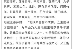 安徽九华山 与浙江普陀山,山西五台山、四川峨眉山、并成为佛教四大名山,九华山是大愿地藏王菩萨道场,也是唯一有肉身菩萨的佛教圣地。