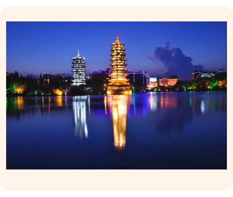 桂林日月塔 又称金塔银塔、情侣塔;日塔别名叫金塔,月塔别名叫银塔,所以也有金银塔之称。日月双塔坐落在桂林市美丽的杉湖中,日塔为铜塔,位于湖中心,高41米,共9层,月塔为琉璃塔,高35米,共7层。两塔之间以湖底一条10米长的湖底隧道相连。