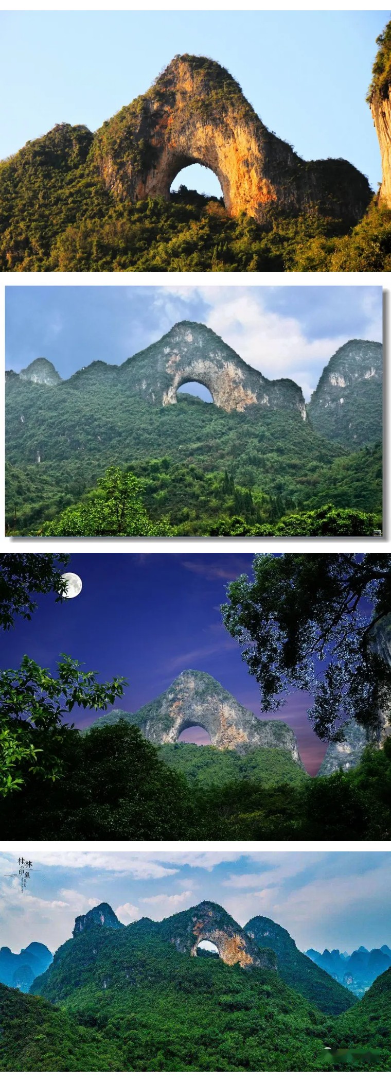 月亮山是阳朔境内的奇景,它在高田乡凤楼村边,高达380多米。因为山顶是有一个贯穿的大洞,好像一轮皓月,高而明亮,所以人们叫它明月峰,俗称月亮山。
