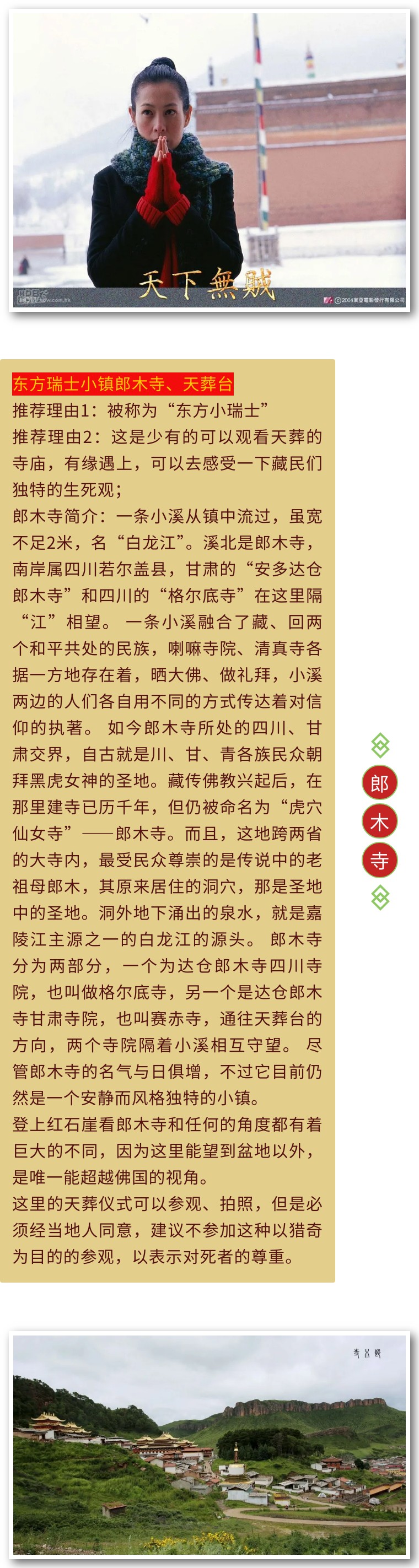 有那么一个地方,云端世界,心生光芒。《天下无贼》中,刘若英说,我想停下来,认认真真的拜拜佛。她是看到了拉卜楞寺的晨光,从云端喷薄倾泻,笼罩着云雾升腾的寺院,庄严肃穆,宁静祥和,有醍醐灌顶般的顿悟。它就是被叫做云端最恬静的地方俗称“小西藏”的——九色甘南。