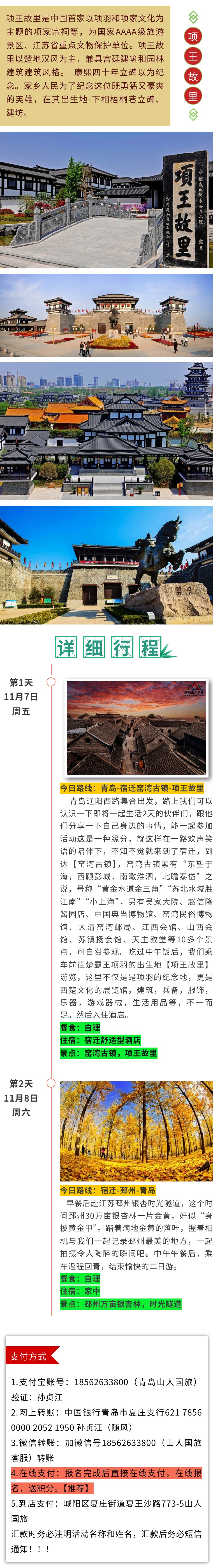 【VIP头等舱21人•2日•银杏时光隧道】11/7~8日苏北邳州万亩银杏林•千年窑湾古镇•乾隆行宫•宿迁项王故里 [复制链接]