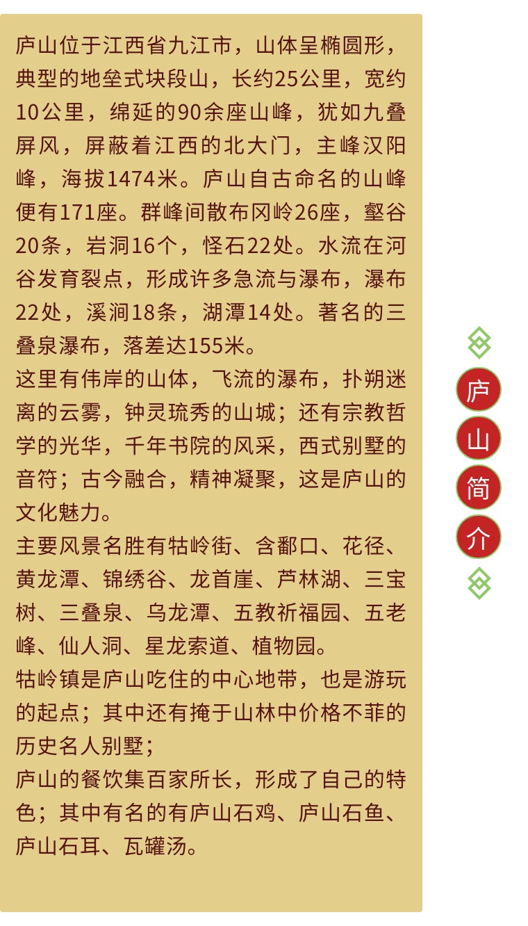 庐山以雄、奇、险、秀闻名于世。素有‘匡庐奇秀甲天下’之美誉。巍峨挺拔的青峰秀栾、喷雪鸣雷的银泉飞瀑、瞬息万变的云海奇观、巧夺天工的异国风情建筑,一展庐山的无穷魅力!