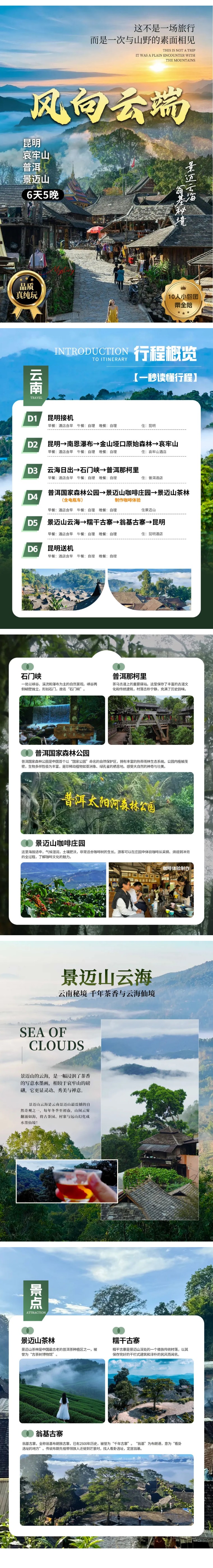 ◆酒店早餐结束后乘车前往【景迈山云海】景迈山的云海,是一幅浸润了茶香的写意水墨画,相较于哀牢山的磅礴,它更显灵动、秀美与禅意。由于景迈山得天独厚的地理与气候条件,这里一年中有近半时间都能邂逅云海奇观。观赏景迈云海的最佳地点,往往就在您所居住的客栈露台,或是千年万亩古茶林之畔。