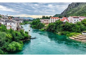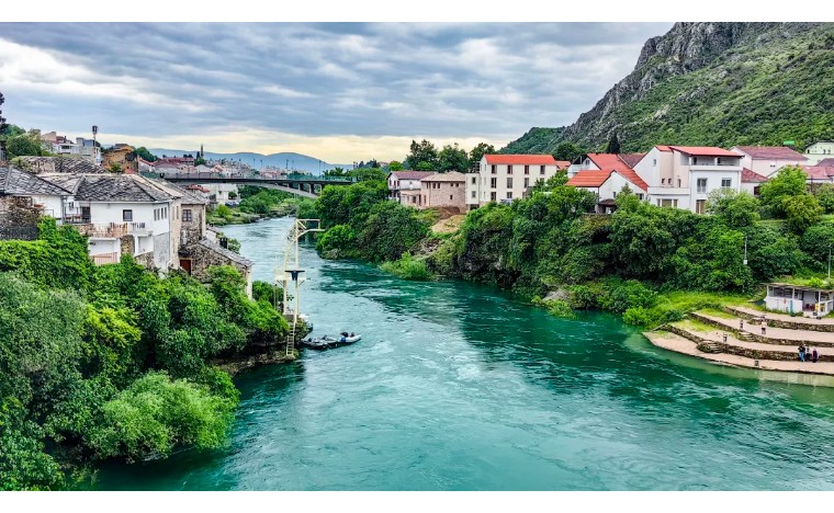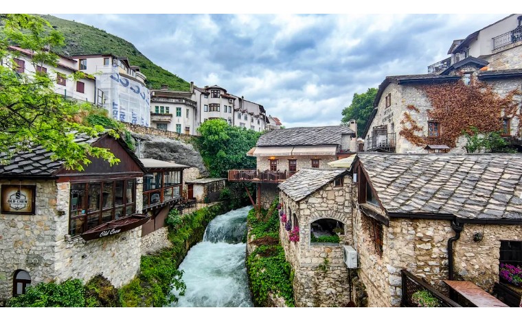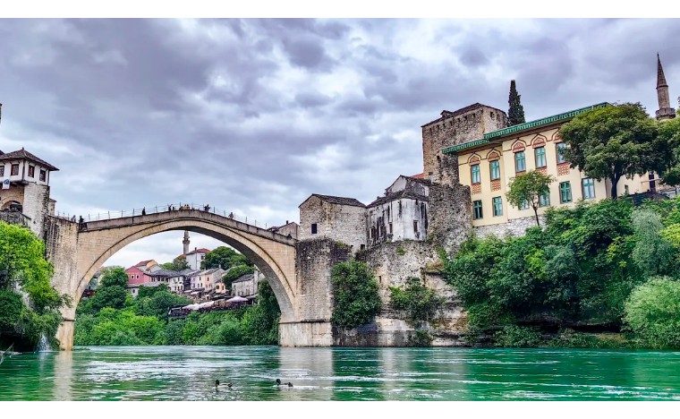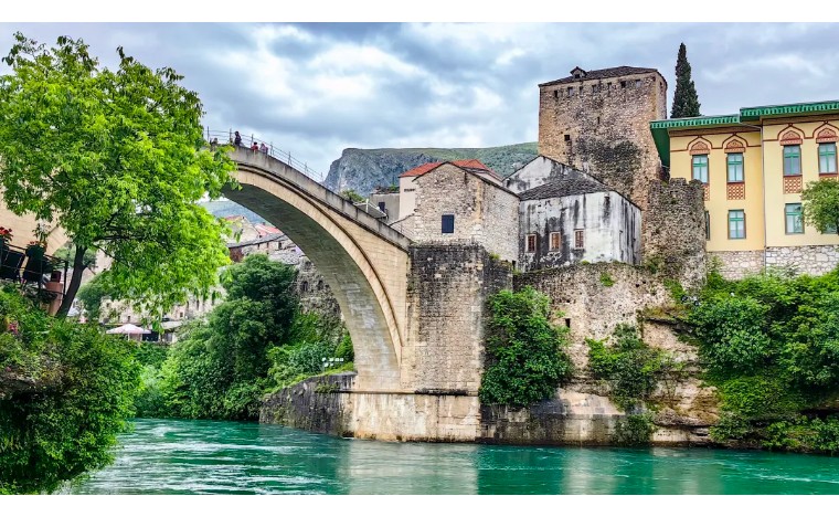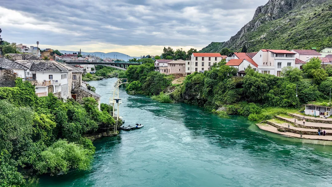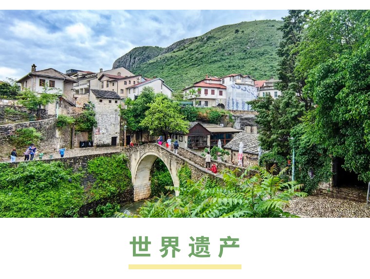 波黑——莫斯塔尔老城的老桥区:16世纪奥斯曼古桥横跨翡翠色内雷特瓦河,两岸中世纪石屋与清真寺相映,见证波黑多元文化交融,跳水勇士传统延续450年。
