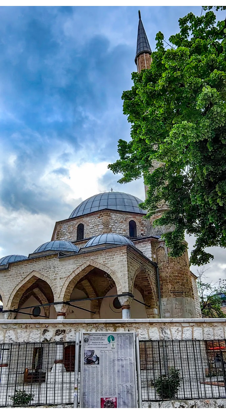 巴尔干最美伊斯兰圣殿——这座16世纪奥斯曼帝国杰作,拥有独特的粉色穹顶和47米高铅笔形宣礼塔,内部装饰着2万片波斯彩瓷,被誉为"欧洲的蓝色清真寺"。是波黑和巴尔干半岛最大的清真寺,如今它的一座穆斯林风格的八角形墓室就在清真寺内,从它最高点,往西看去,有一座和宣礼塔一样高挑的钟楼,是电影《瓦尔特保卫萨拉热窝》中一处重要的取景地。