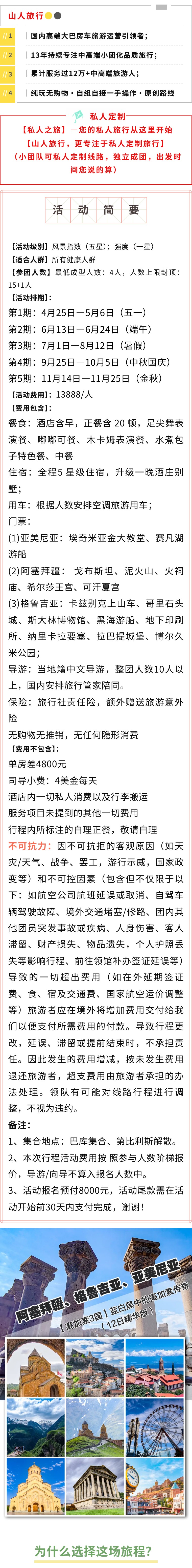 三国穿越:从阿塞拜疆的现代化都市巴库,到格鲁吉亚的历史古城第比利斯和浪漫小镇西格纳吉,再到亚美尼亚的古老修道院,你将体验到高加索地区丰富多样的文化遗产。