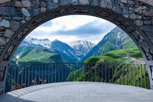 古多里参观【格俄友谊纪念碑】达力尔峡谷边的山顶建有一座俄格友谊纪念碑,平台上画着非常有高加索民族特色的壁画,这里视野极好,远处是云雾中连绵起伏的群山,纪念碑的下方是一道山谷,山谷中有一汪碧蓝的池水,就像一颗巨大的蓝宝石镶嵌在翠绿色的山谷中。