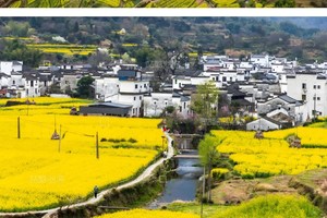 一园春色:婺源江岭,那里漫山遍野的油菜花呈梯田状,从山顶铺散到黑瓦白墙的徽派民居里,一直到山谷的最远端。