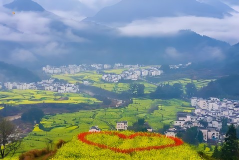 一园春色:婺源江岭,那里漫山遍野的油菜花呈梯田状,从山顶铺散到黑瓦白墙的徽派民居里,一直到山谷的最远端。