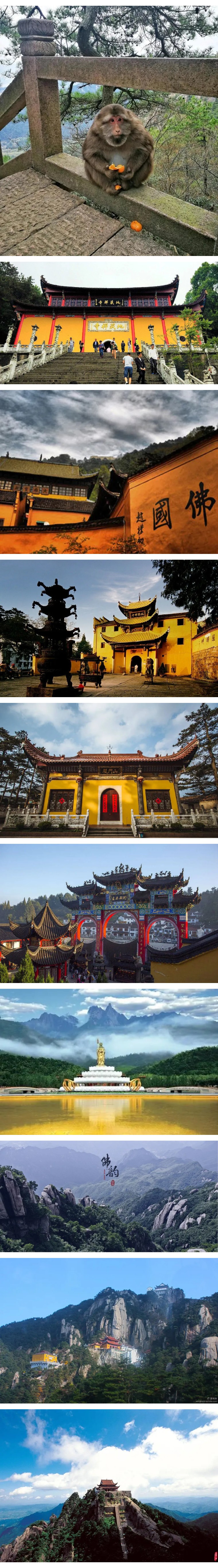 安徽九华山 与浙江普陀山,山西五台山、四川峨眉山、并成为佛教四大名山,九华山是大愿地藏王菩萨道场,也是唯一有肉身菩萨的佛教圣地。