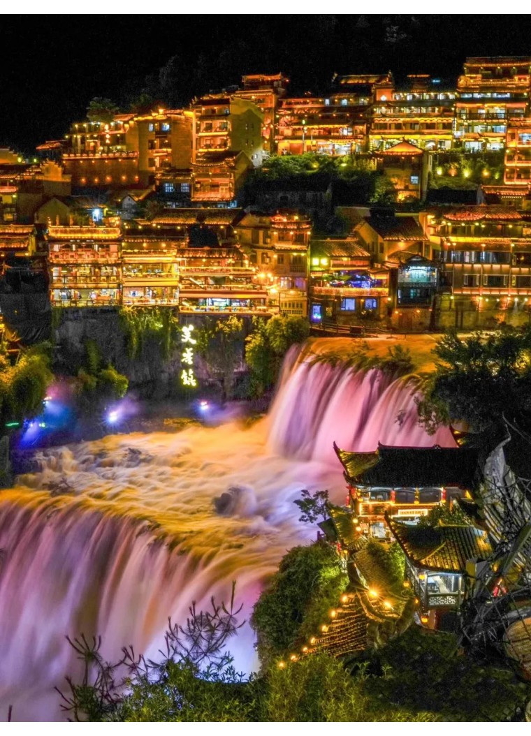 “挂在瀑布上的千年古镇”是芙蓉镇最出名的广告这一点,湘西四大古镇之一,坐落在一条巨大的瀑布之上和两侧,感觉很像仙侠的世界,尤其是夜景。很多影视剧都曾在这里取景。