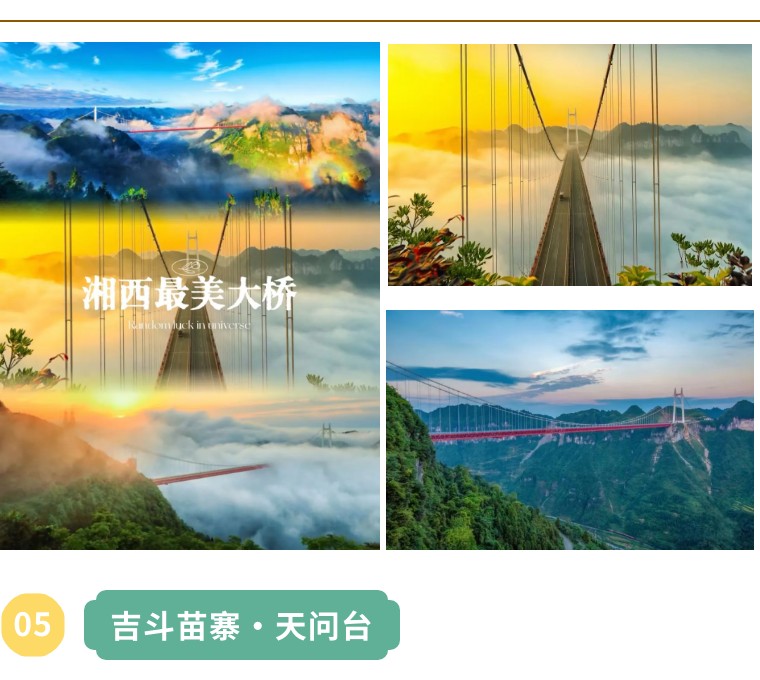 之后前往【矮寨大桥】耗资15亿建成的世界4个第一的大跨峡谷悬索桥—湘西矮寨大桥,后换乘景区观光车游览湘川公路上最险要的关卡—矮寨公路奇观,观赏中国第一座公路立交桥、开路先锋铜像、史上牛交警执勤台等,至矮寨大桥观光平台近距离观赏世界第一的跨峡谷大桥。