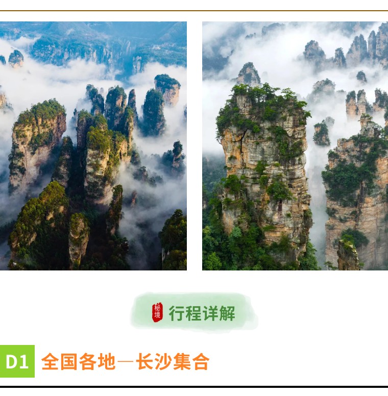 之后从袁家界坐环保车到杨家界,步行游玩杨家界2.5小时,沿途欣赏一步登天、五郎拜佛、空中走廊、天然长城等景点,由于景点分散,需要走回头路,可根据体力选择一到两个景点游玩。