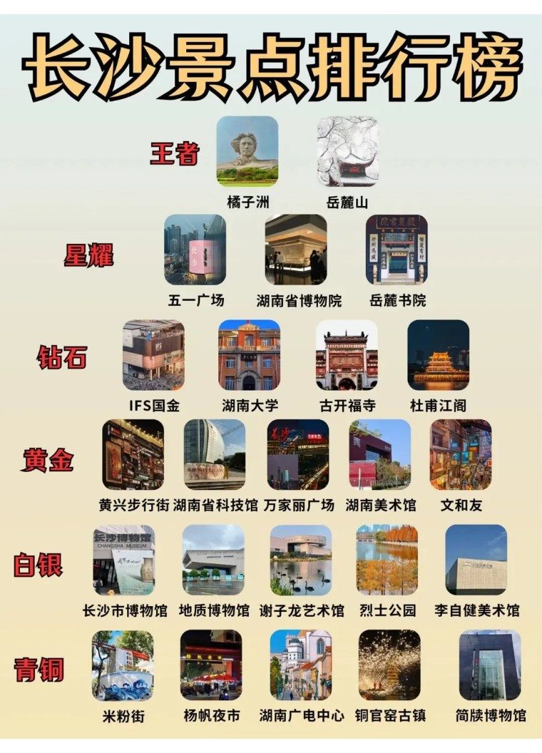 长沙美食:火宫殿、向群锅饺、文记热卤四合一、黑色经典臭豆腐、伍氏猪脚、老长沙大香肠、长沙老龙虾馆、帅哥烧饼、李公庙糖油粑粑、四娭毑口味虾等。