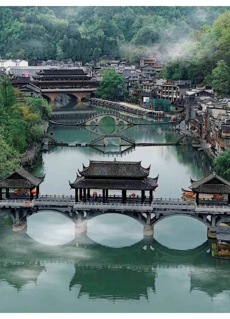 在凤凰古城的边上,有一个不能错过的小众景点叫长潭岗,位于凤凰古城沱江的上游,这里并不是一个山岗,而是一个古桥,超美。