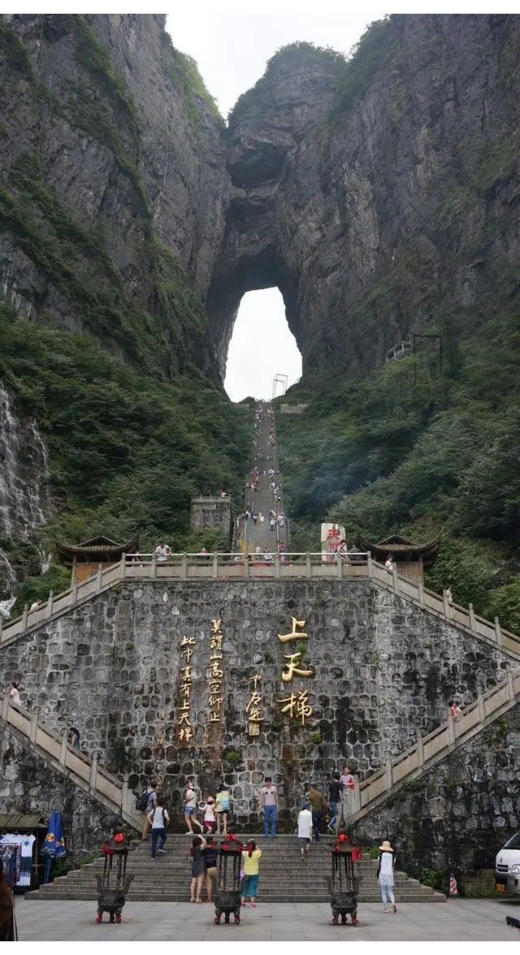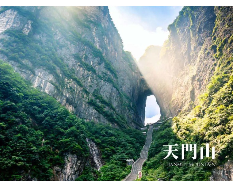 天门洞开:九百九十九级台阶登上天门洞,登天祈福。高131.5米,宽50余米,南北对开于千寻素壁之上,气势磅礴,巍峨高绝,是罕见的高海拔穿山溶洞, 更是尽显造化神奇的冠世奇观,2006俄罗斯空军张家界天门山特技飞行表演让天门洞悬念升级,再次成为全球焦点。