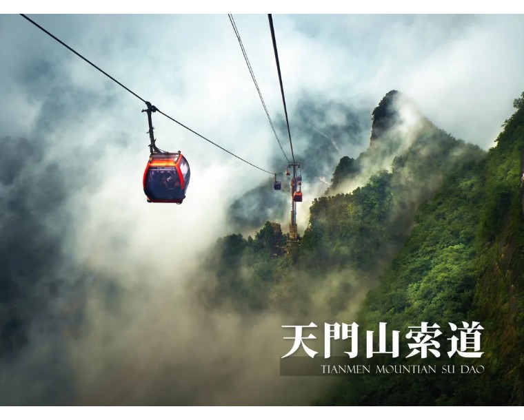 天门索道:索道线路斜长7455米,上、下站水平高差1279米,是世界最长的单线循环脱挂抱索器车厢式索道,犹如一道彩虹飞渡“人间” “天上”,又象一条巨龙腾翔素云苍穹,依山籍壁,拔地冲天,荡气回肠,恢宏壮观,成为天门山旅游风景区“四大奇观”之一。