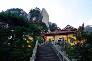 九华山奇峰秀丽,峰高云端,山峦起伏,峰数有九,故称九子山。又因有九峰形似莲花,因此而得名;有“莲花佛国”之美称。九华山有九十九座山峰,主峰十王峰海拔1342米,山体由花岗石组成,山形峭拔凌空,素有“东南第一山”之称,至今保留着乾隆御赐“东南第一山”金匾,悬挂在“护国月身宝殿”正门的上方。